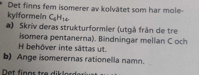 Jo, det kan ju finnas substitueneter på kol 1 2 och 3. Sedan finns det n-hexan. Sedan finns det två substituenter på samma kol. Det blir totalt 6 st isomerer om inte jag misstar mig.