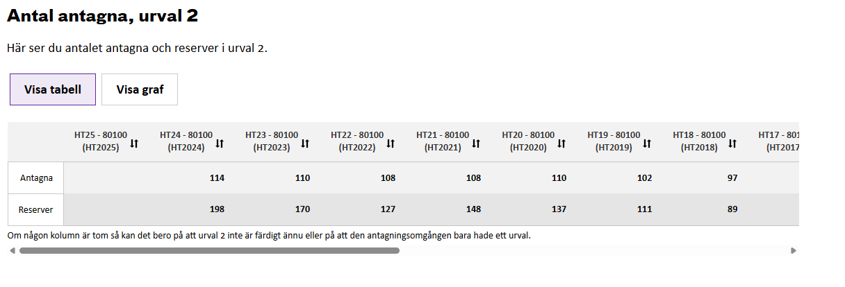 I urval 1 blev 130 personer antagna och 412 stod på reservlistan, och efter urval 2 står det 114 antagna och istället 198 reserver.