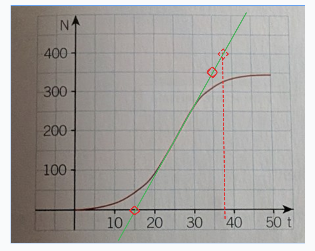 Det ser ut som att kurvan mellan t= 20 och t =30 har samma lutning, dvs är en linje mer eller mindre. Jag får då lutningen ~ (260-80)/(30-20) = 18. Nästan som facit då..