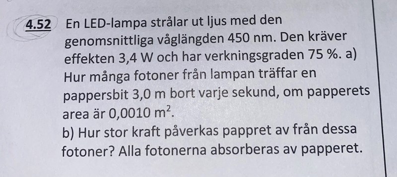 Jag räknar ju fotonenergin genom den givna våglängden. Sedan är ju nyttiga effekten 3,4 x 0,75 W och varje sekund motsvarar det 3,4 x 0,75 J. Kan dela den med den enskilda fotonenergin för att få antalet fotoner. Det blir givetvis fel. Förstår inte varför. Uppskattar hjälp!