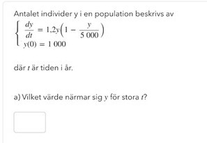 Derivatan är y' = 1,2(1-y/5000). Om vi startar när t = 0 får vi veta att y(0) = 1 000, så y' =1 200(1-0,8) = 960. Så länge y är mindre än 5 000 kommer y' vara positiv, men ju närmare 5000 man kommer desto mindre blir värdet.