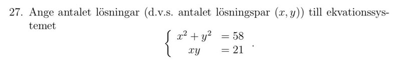 Hur hittar du fler än 4 lösningar? Kom ihåg att dina lösningar måste satisfiera båda ekvationerna, dvs även xy = 21 måste vara uppfyllt (x = 7, y = -3 är alltså inte en lösning).