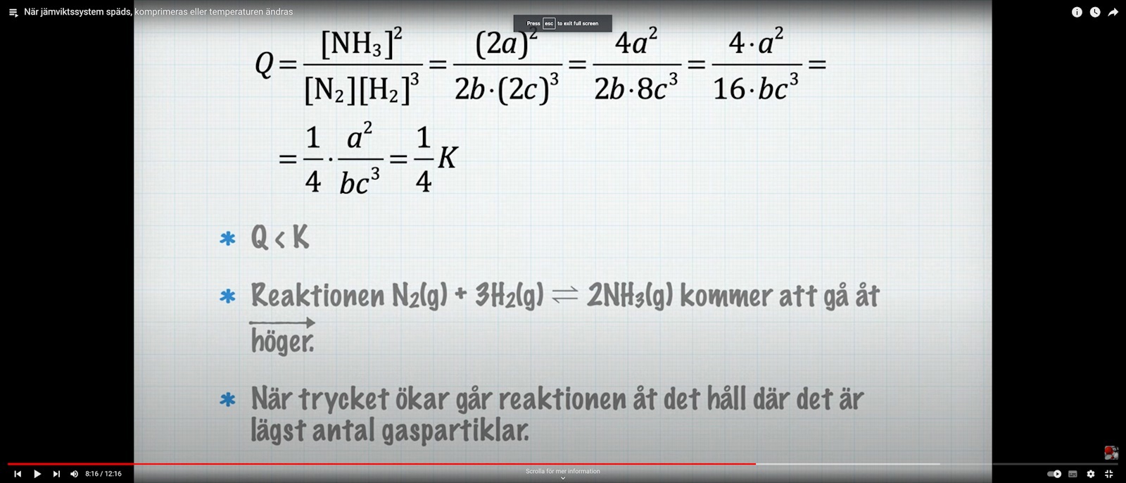Nej, man tittar bara på reaktionsformeln. På vänstersidan är det en kvävgasmolekyl och tre vätgasmolekler - 4 partiklar. På vänstersidan är det två ammoniakmolekyler, alltså 2 partiklar. Om reaktionen går åt höger kommer antalet partiklar att minska. Om reaktionen går åt vänster kommer antalet gaspartiklar att öka.