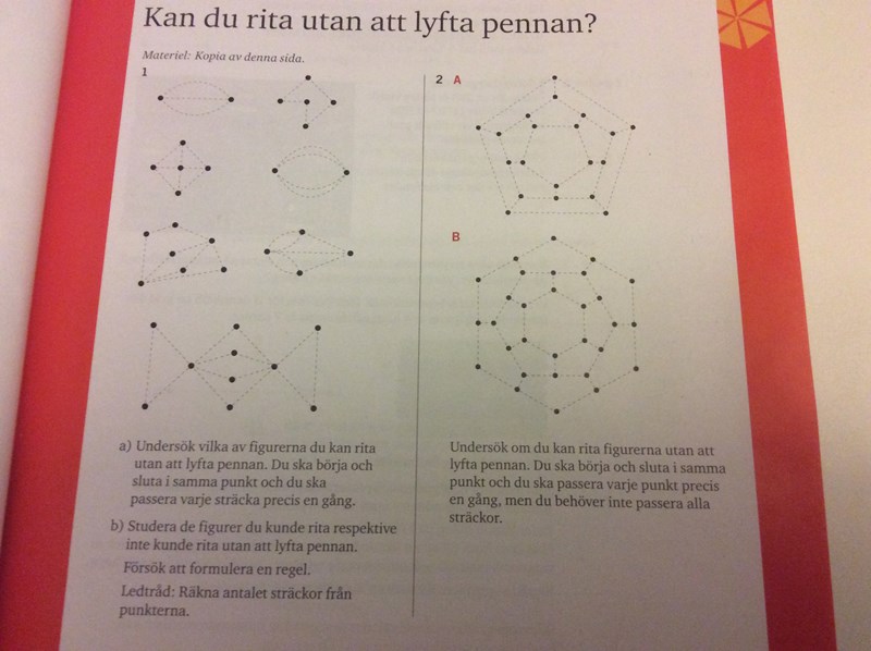 Blir slutsatsen då att man kan rita utan att lyfta pennan om alla punkter har lika antal sträckor? I så fall skulle det betyda att det är omöjligt att rita utan att lyfta pennan på då två stora figurerna längst till höger? (detta är en sak som jag tänker på och har inte med fråga 2 att göra tror jag, bara så att jag är med och förstår :) )