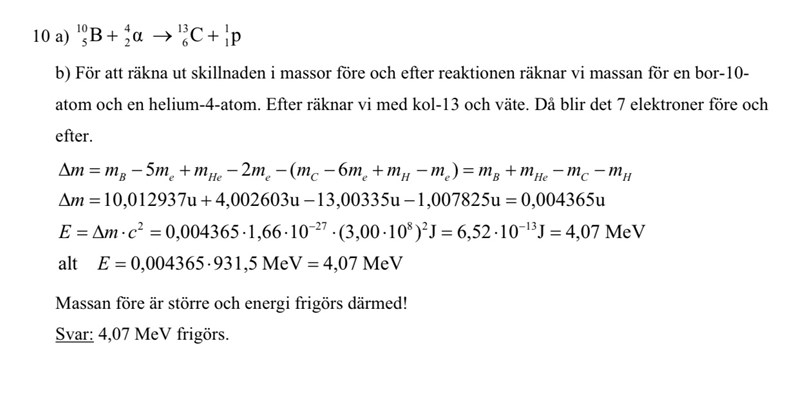 Hej! Facit har subtraherat med massan för väte när det står i uppgiften att det är en proton som skickas ut. Jag och facit fick samma slutliga svar men massdefekten är inte identisk. Varför stämmer inte min beräkning? Måste jag tänka på att när uppgifter säger att en proton skickas så innebär det att väte skickas ?( varför har inte facit isåfall skrivit C-13 + 1-väte på höger led?) Tack på förhand!