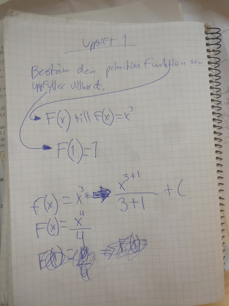 Uppgiften har dock gett dig lite extra information om funktionen nämligen att F(1)=1 som gör att du kan ta reda på konstanten. Uttrycket F(1)=1 betyder att för x-värdet 1 i den primitiva funktionen blir funktionsvärdet(y) lika med 1. Sätter du in dessa villkor i din primitiva funktion så är endast C obekant och går att bestämma. Som föregående talare skrev så kan det vara så att du gjort detta utan att visa det, men det kan också bara vara så att du råkade få fram rätt funktion för att konstanten var lika med noll. Oavsett så hade du behövt redovisa denna uträkning/resonemang.
