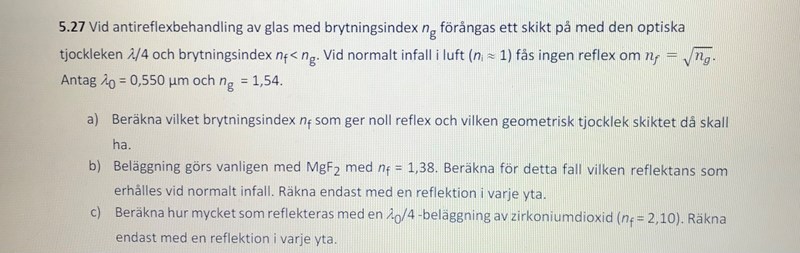 På c har jag alltså tänkt att eftersom de båda reflektionerna delvis släcker ut varandra så ges den totala intensiteten av dess differens. Svaret på b ska dock vara 0,011 och 0,24 på c. Vad gör jag för fel?