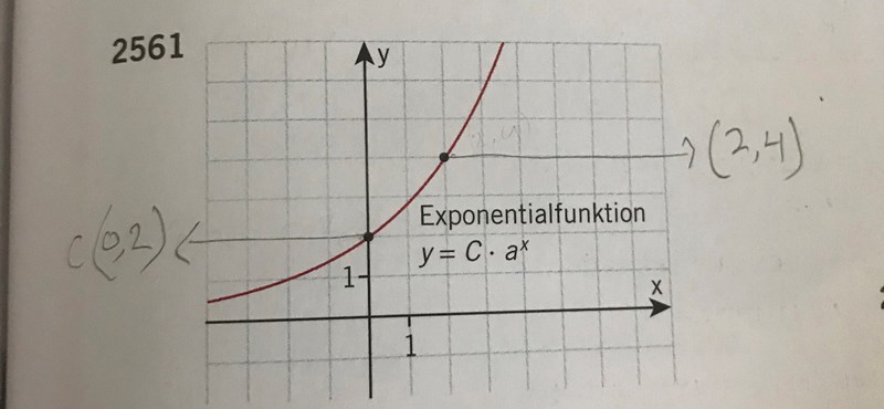 Du har punkten (2,4), du vet att y=Cax och du vet (tack vare punkten (0,2) ) att C= 2.Det gäller alltså att 4=2a2. Vilket värde har a?