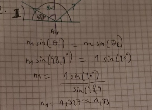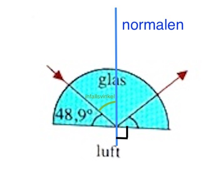 Jahaa aa det känns logiskt för vinkeln 48.9+infallsvinkel ger en 90 grader vinkel. Då förstår jag!