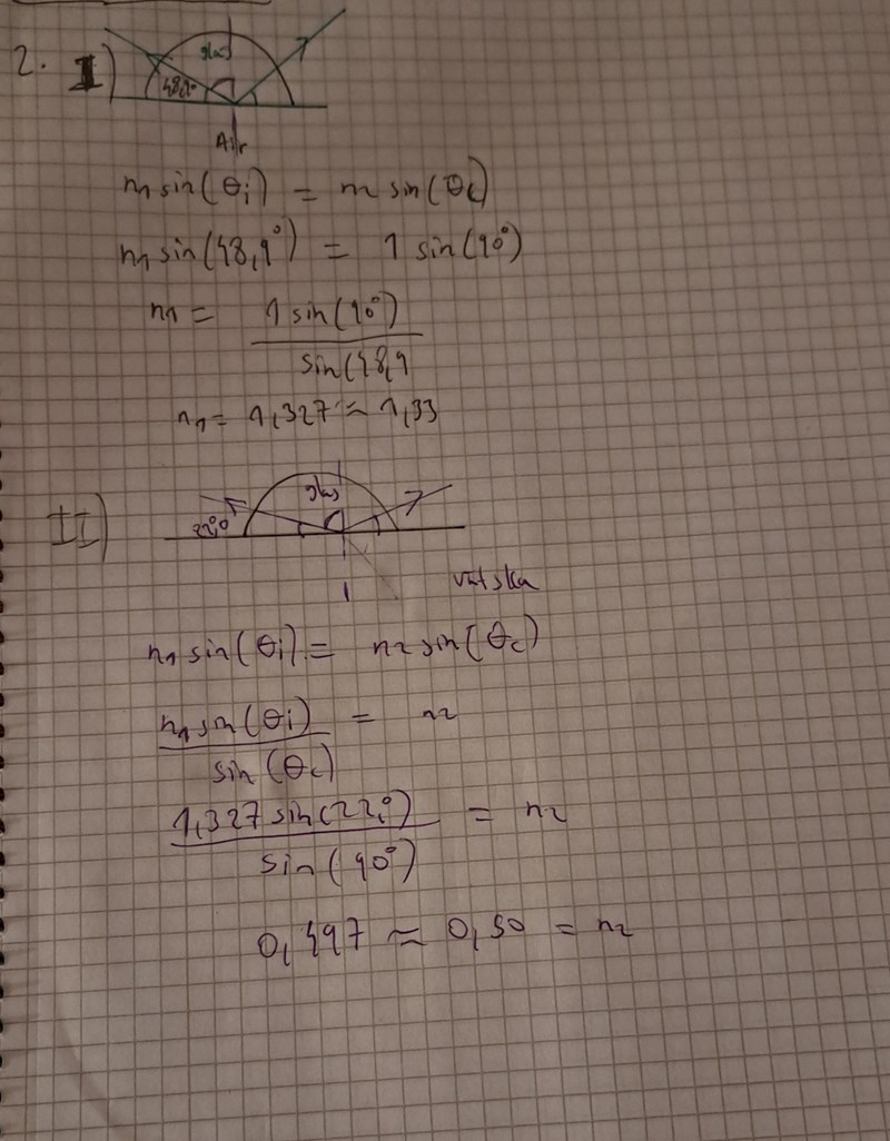 gäller det här enbart detta uppgift ? jag har för mig man skriver alltid n1sin(i)=n2sin(b) givet att man känner infallande vinkel samt brytningsvinkel. Jag antar att vinkeln uppgiften givit oss inte är den infallande vinkel och måste alltså ställa upp på det sättet du gjort för att lösa ut infallande vinkel. sen tycker jag det är lurigt eftersom infallsvinkeln är ju den där kritiska vinklarna de gav oss, men ändå så är det inte..