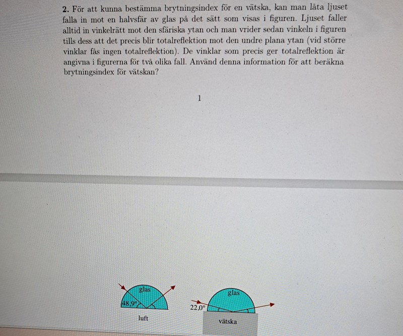 Pieter Kuiper skrev:destiny99 skrev:Jag har ofta problem med såna frågor och identifierade infallsvinkeln som de angivna vinklarna i frågan men rätt svar på vätskans brytningsindex är 1.41. Hur ska man tänka?