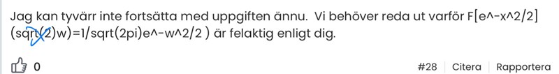 Jag kan tyvärr inte fortsätta med uppgiften ännu. Vi behöver reda ut varför F[e^-x^2/2](sqrt(2)w)=1/sqrt(2pi)e^-w^2/2 ) är felaktig enligt dig.