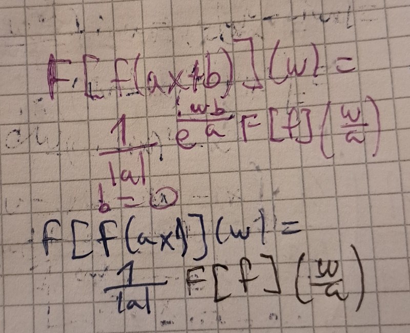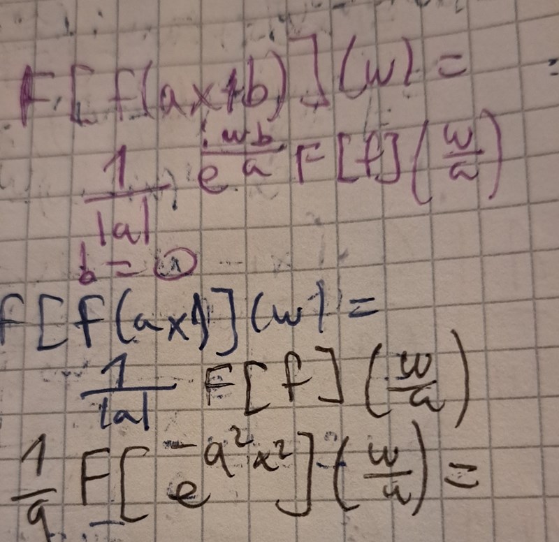Ja jag vet. Men sätter man VL lika med HL så blir det så. Väljer man a=1/sqrt(2) så blir det sqrt(2)w på HL enligt ii). Nu svarade du inte på min fråga om vad f(ax) är på VL , men jag tror det är e^-(ax)^2 där a=1/sqrt(2)