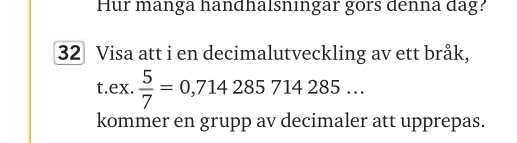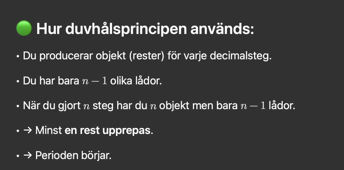 Hej, jag vet att "lådorna" i uppgiften är divisionens rester. Ex. för a/b är resterna = (0,1,2,3... (b-1)). Hur många decimaler (objekt) finns det? Kan någon också bevisa varför resterna blir just så många? Tänker jag rätt?