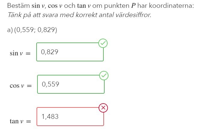 Det står att jag har fel antal siffror. Korrekta svaret är 1,48. Nästa övning var det samma fel på, jag fick värdena (0,34; 0,94) och fick svaret tan v = 2,76, men korrekta svaret var 2,8.