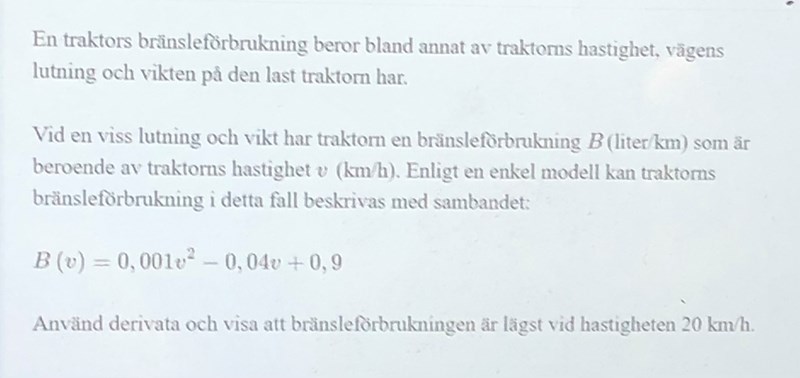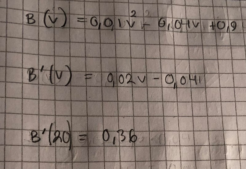 Frågan är hur man kan utnyttja derivata för att inse att värdet är lägst vid v=20 km/h. Derivatafunktionen B'(x) som du skrivit upp beskriver ju lutningen på funktionen för varje punkt på grafen, eller hur? Där vi har en minimipunkt i B(x), är ju lutningen noll och då måste derivatan vara noll!