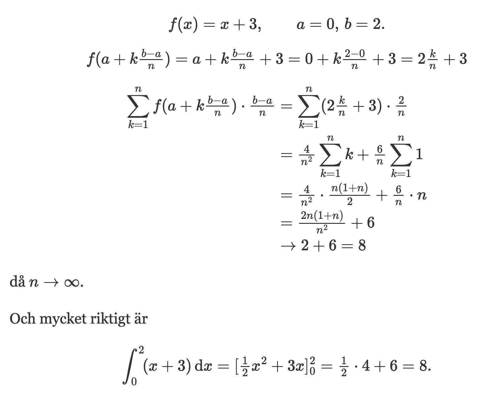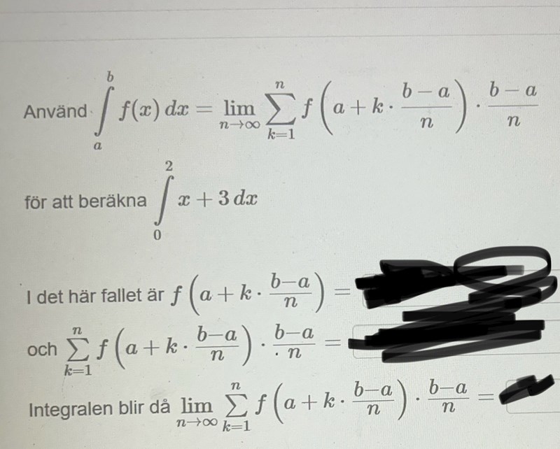 tusen tack :) ska n = oändligheten? Får inte riktigt till vad f(a+k*b-an) är, eller vad k=1nf(a+k*b-an)*b-anär?:)