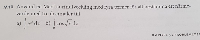 Jag försökte lösa uppgiften genom att först bestämma MacLaurinutvecklingen av e^x² m.h.a produktregeln men får fel svar när jag vidare ska integrera