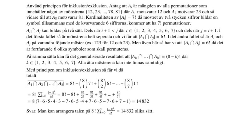 Jag har gjort försök att förstå lösningen där representerar olika mönster och där principen för inklusion/exklusion tillämpas. Tyvärr har jag svårt att koppla ihop dessa med varandra och förstå varför de används på det sättet de gör. Kan någon snäll själ vara vänlig nog att bryta ner stegen på ett mer pedagogiskt sätt och förklara hur man når fram till det angivna svaret ?