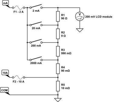 Se R1 ... R5 som en spänningsdelare. Kopplar man in mätområdet 200 mA så fördelas strömmen man mäter till två grenar. Den ena (I1) går genom R3 R4 R5 till COM. Den andra (I2) går genom R2 R1 LCD voltmeter till COM. En LCD voltmeter har en mycket hög resistans (typiskt 10 Mohm eller mer) för att inte belasta det man ska mäta.