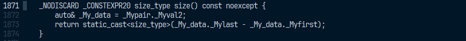 size_t är en osignerad heltalstyp som definieras av standardbiblioteket och är avsedd att representera storleken på objekt i minnet. Det är en implementationstyp, vilket innebär att dess faktiska storlek och representation kan variera beroende på vilken plattform och kompilator du använder. I min specifika miljö (MSVC x64) är size_t = size_type i själva verket en unsigned long long.
