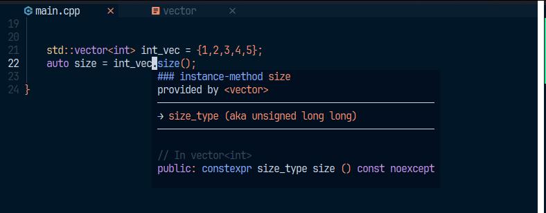 Så här ser det ut när jag använder min LSP för att ge mig information metoden size():