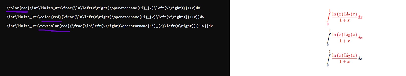I bilden ovan kan man se hur \color och \textcolor fungerar. \color färgar allt i uttrycket man skrivit in det, medan med \textcolor kan man lägga på ett par hakparenteser för att markera det man vill ha färgat. På PA renderas tyvärr inte det tredje uttrycket med färg: