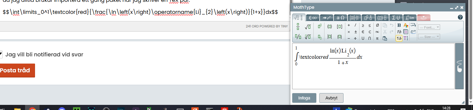 Tack för ditt svar. Jo, jag har märkt några saker med LaTeX här. Jag kände inte till det där om \color, så om jag vill färga något i framtiden här kommer det vara lättare, tack!