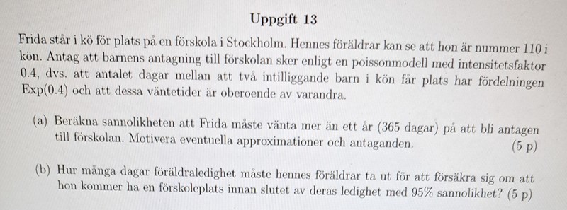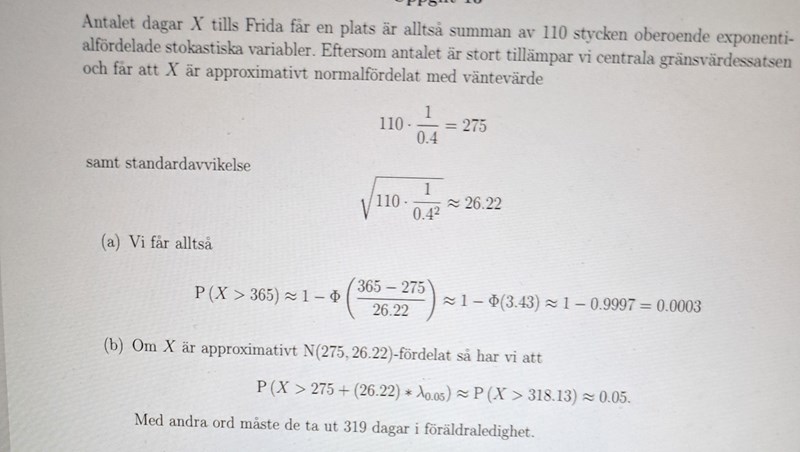 Vi definierar den stokastiska variabeln Y som väntetiden för barnet som står först i kön. Det står att Y har fördelningen Exp(0,4). Väntetiden för barnet som är först i kön kommer alltså från den fördelningen. Om Frida hade varit på plats 2 i kön så hade hon först fått vänta på att första barnet fick plats och sedan vänta på sin tur som har samma fördelning som Y. Totala väntetiden hade då haft en fördelning som är summan av 2 st Exp(0,4) fördelningar. Nu står Frida på plats 110 och hennes väntetid X har en fördelning som är summan av, inte 2 utan, 110 st Exp(0,4) fördelningar, vilket de i facit approximerar med en normalfördelning.