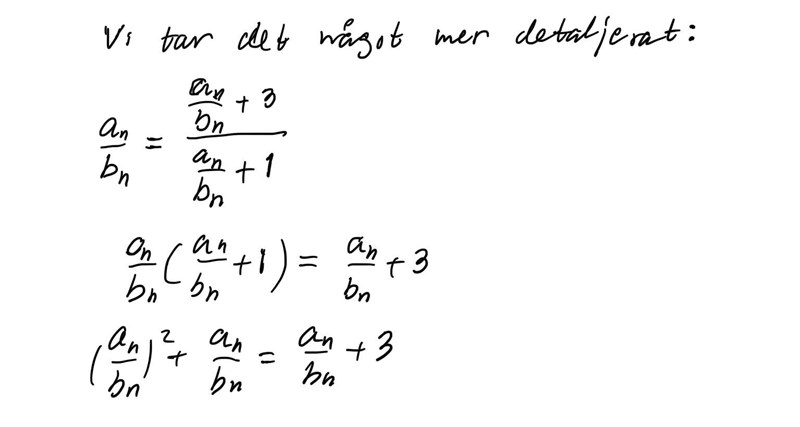 Det är så talserien är skapad. Nästkommande tals täljare är summan av föregående täljare plus 3 gånger föregående nämnare. Nästkommande nämnare är summan av föregående täljare och nämnare.