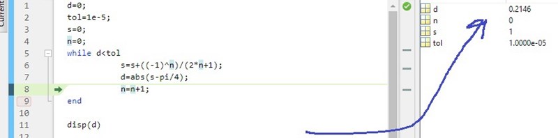 Hej, har lite problem med a uppgiften, har skrivit följande kod och håller på och debuggar, efter första iterationen så är mitt värde på d=0.2146 vilket följer att villkoret i whilesatsen är falskt sant men ändå så stoppas loopen, vad är det som händer?
