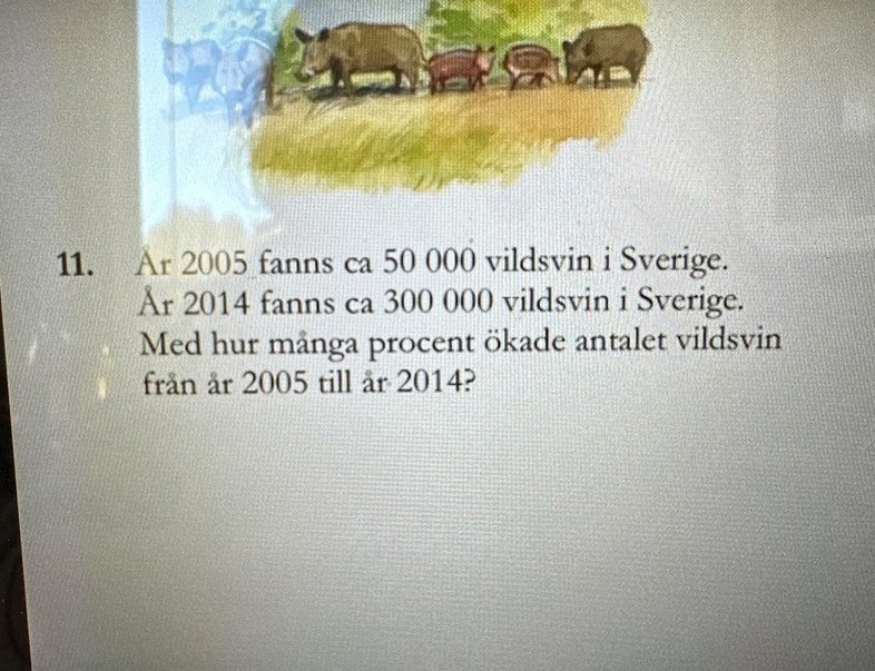 År 2005 fanns Ca 50 000 vildsvin i Sverige. År 2014 fanns ca 300 000 vildsvin i Sverige. Med hur många procent ökade antalet vildsvin från år 2005 till år 2014?