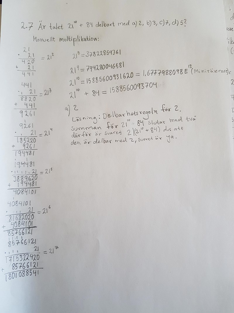 Jag svarade ja och här så vi visar jag hur jag kom fram till svaret. Jag valde för säkerhets skull att multiplicera manuellt efter som när jag kommer fram till 21^(10) så får jag ett annorlunda svar från miniräknaren. Jag använde mig av delbarhetsregeln för 2, för att komma fram till svaret. Vad har jag gjort för fel? Jag tar gärna emot förslag/tips på hur jag kan på ett smidigare sett lösa det här.