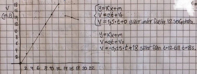 v1-v0=a*Δt => v1-0=1,5*12=18m/s, vilket är rätt.