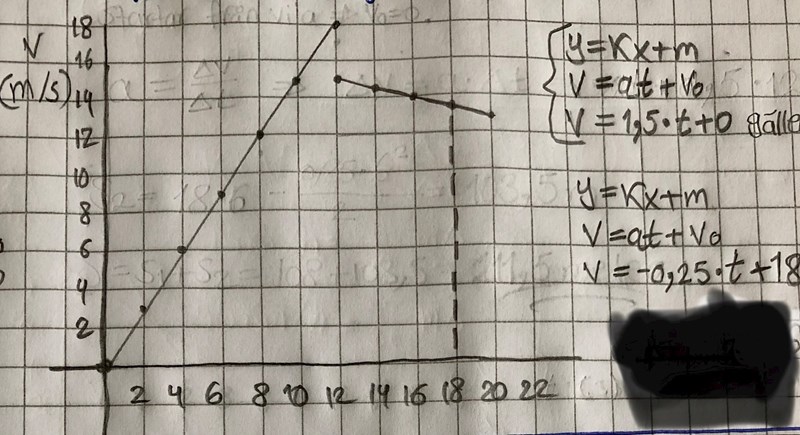 v0 för den andra sträckan som är en inbromsning är ju sluthastigheten efter den första accelerationen. Vad för hastighet får ett objekt som accelererar med 1,5 m/s2 i 12s? Det är lättare än du tror.