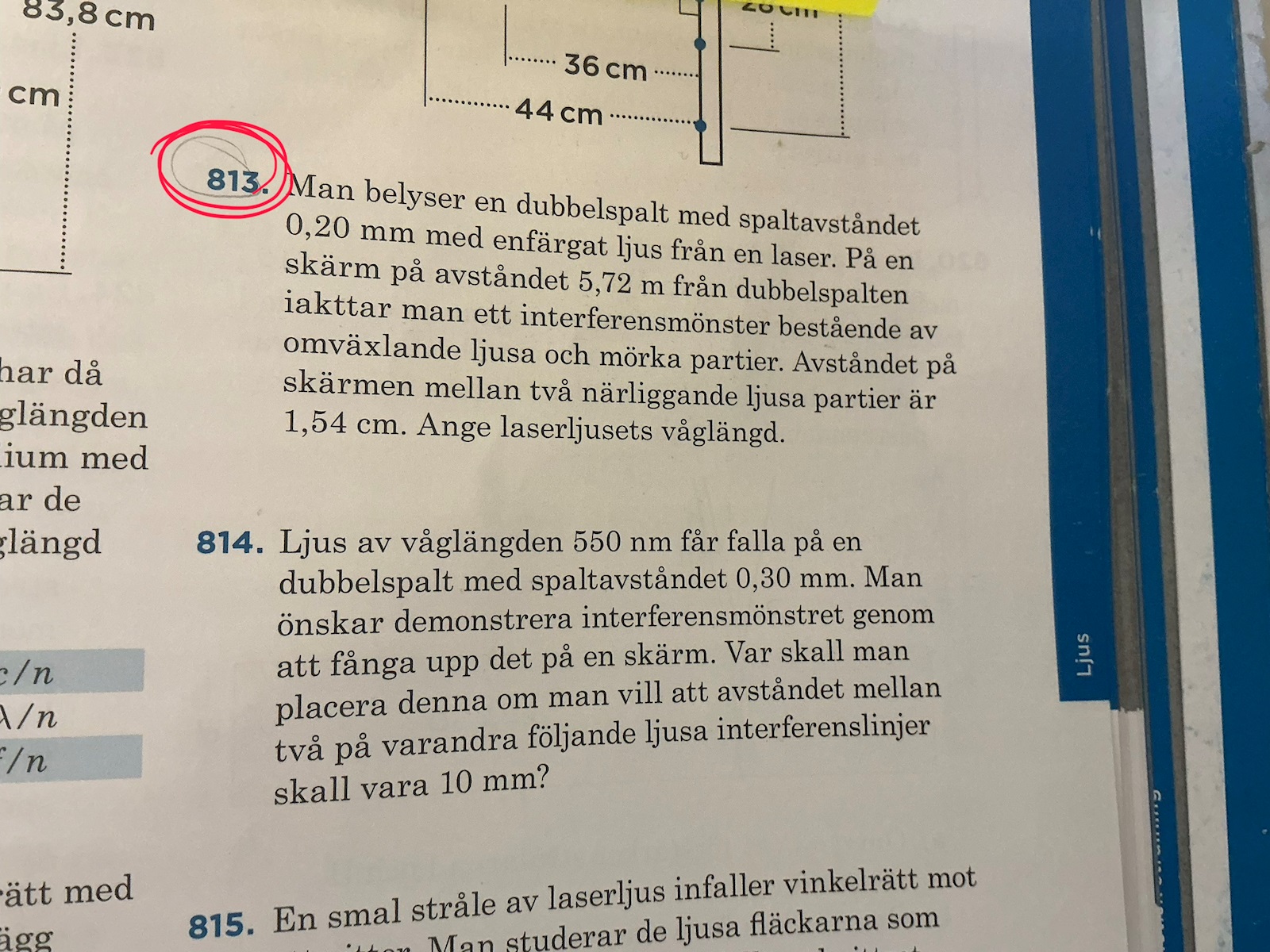 Facit antar att dessa två ljuspunkter motsvarar k = 0 och k = 1. Kan man göra det antagandet? Är avståndet mellan ljuspunkter för interferens i dubbelspalt lika stort för alla värden på k?
