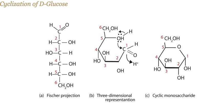 När de linjära formerna av kolhydrater som aldoser (t.ex. glukos) och ketoser (t.ex. fruktos) bildar sina ringformer, används en hydroxigrupp för att bilda en ny bindning till aldehydgruppen (kol 1 i glukos) eller en ketogruppen, och på så vis fås ringformen av kolhydraten.