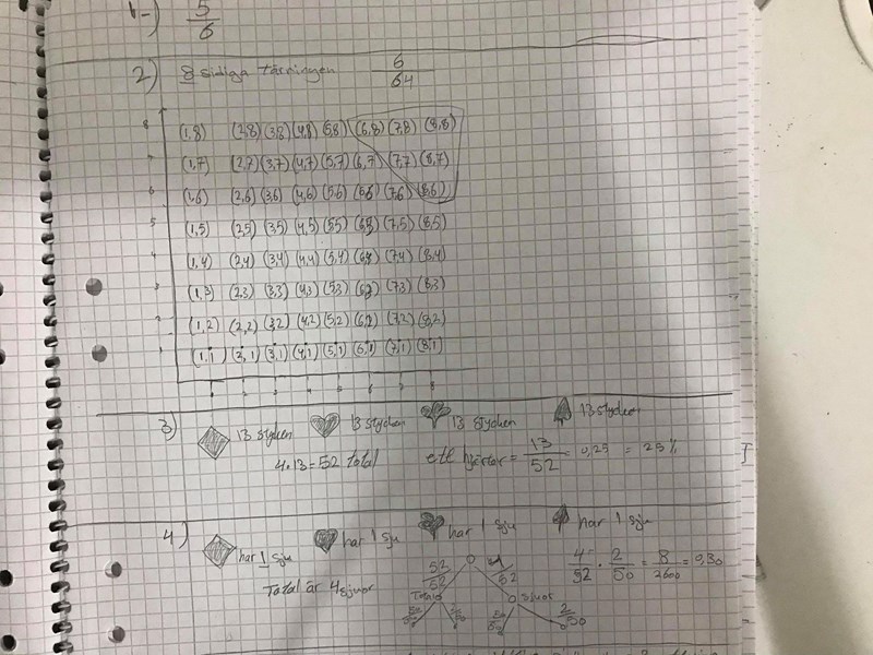 Fråga 4. En vanlig kortlek innehåller 52 kort. Ange sannolikheten att två dragna kort är två sjuor.