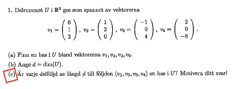 Det jag har kommit fram till är att v1 och v2 är en bas i U samt att v3 och v4 är linjärt beroende. Betyder det då att C inte stämmer?