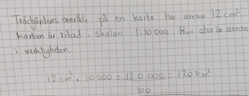Här får du dels använda rätt antal cm2 per m2, dels göra om längdskalan till areaskala.