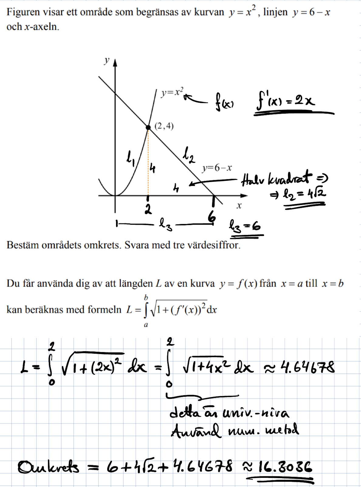 Du ska inte stoppa in några siffror i själva integranden. Det ska alltså inte stå f'(2) utan enbart f'(x). Sen gör du det lite klurigare för dig själv. Behöver formeln verkligen användas för alla delar? Mellan A och C och B och C är det ju bara raka linjer. Då kan du använda avståndsformeln för att få fram de sträckorna. Sen kan du använda formeln i uppgfiften för den böjda linjen mellan A och B.