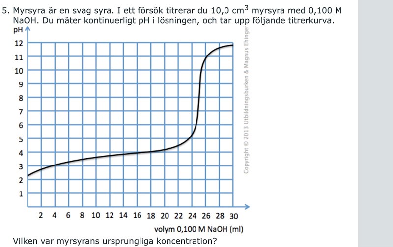 När man utför en titrering och ritar en titrerkurva så är man ute efter ekvivalenspunkten vilken här finns vid 25 cm3 tillsatt titrator. Eftersom koncentrationen är 0,100 mol/dm3 har man då tillsatt 0,0025 mol natriumhydroxid. Enligt reaktionsformeln är ekvivalensförhållandet med myrsyran 1:1 så det fanns även 0,0025 mol myrsyra i lösningen från början. Det innebär att dess ursprungliga koncentration var 0,25 mol/dm3.
