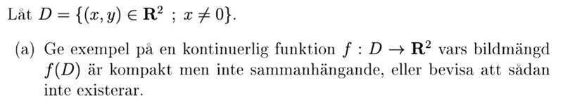 Hursomhelst är det inte så att den cirkelbåge med x < 0 och den cirkelbåge med x > 0 båda är slutna mängder i den relativa topologin på den mängd (rum) som utgörs av båda cirkelbågarna. Då är väl hela detta ”rum” unionen av två disjunkta slutna mängder och därmed ej sammanhängande. Eller tänker jag galet?