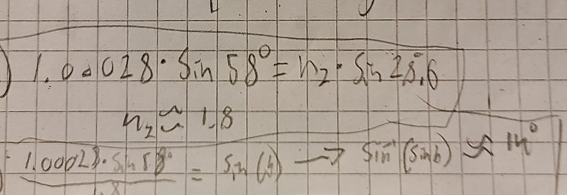 Jag har svårt att se hur du ställer upp ekvationen på b-uppgiften. Men det ser ut som om du använder infallsvinkeln 58° även där?