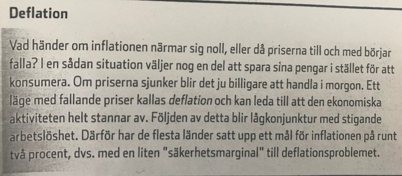 Jonto skrev:Det kan verka så. Att låga priser är bra för den som vill konsumera. Det är dock så att prisnivån generellt är låg, även exempelvis löner och bidrag påverkas av detta och blir lägre. Värdet på ditt arbete är alltså också lägre. Därmed är det INTE "billigare" att handla även om det kan verka så. Om du både får in mindre pengar och har mindrr pengar att handla med, så är det ju oförändrat läge. Pengarna man har är helt enkelt värda mer bara. Eftersom pengarna är värda mycket och räntorna vid en deflation är höga så lönar det sig att spara pengarna för att få dem att växa. Det är däremot riskfyllt att konsumera. Om du väljer att köpa en bil så har du gjort dig av med dina pengar och sitter då sedan med en bil som du sen inte kan sälja för lika mycket som du köpte den för eftersom prisnivån är låg. Om du dessutom skulle behöva låna för att köpa ett hus eller lägenhet så missgynnar det dug istället då höga räntor är illa om du behöver låna. Därför avstår folk vid deflation att investera i saker genom konsumtion. Pengarna är värda mycket men prisnivån är låg så sakerna du köper kommer sen inte ha så högt prisvärde på marknaden.