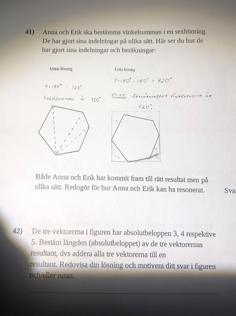 1 sättet) Rita en kvadrat runt sexhörnigen... Då kan vi totalt få 6 ”trianglar” varav 2 trianglar som man ska subtrahera bort. Detta pga att de trianglarna egentligen inte bildar en triangel som passar in i sexhörningen.. Som tex triangel 5 (se på bild) därför ska man ta (180*6-180)-180 vilket är samma sak som 5*180-180