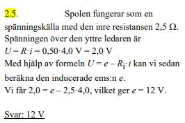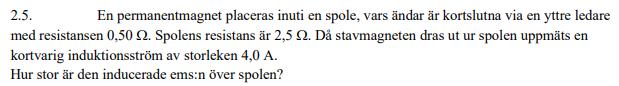 Hmm. Om vi ändrar siffrorna lite, kan vi testa om det blir rätt så som jag gjorde? Låt säga att den yttre ledaren istället har resistansen 0.2 Ohm och spolen har resistansen 2.6 Ohm. Strömmen blir fortfarande 4 A då man rycker ut magneten. Enligt mitt resonemang skulle spänningen över spolen vara: