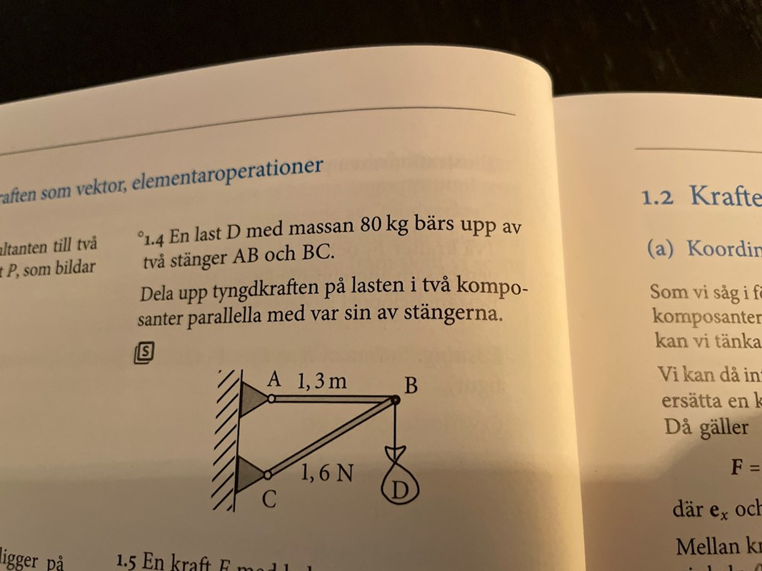 Hej, har fastnat lite på denna uppgift och vet inte om det är jag som inte kan eller om det är fel i uppgiften. Det står att stången BC har en kraft på 1.6N, fattar inte vad jag ska göra med den informationen så jag låtsades som ingenting och skrev om 1.6N till 1.6m och fick då rätt svar när jag gjorde uträkningen. Undrar om det är så man ska göra eller om det finns ett bättre sätt att tänka? Eller om det bara står fel i frågan?