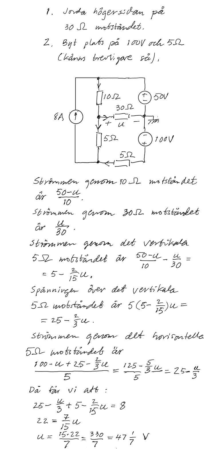 Mitt beräkningsförsök gav styvt 47V på spänningen u. Förhoppningsvis har du facit.