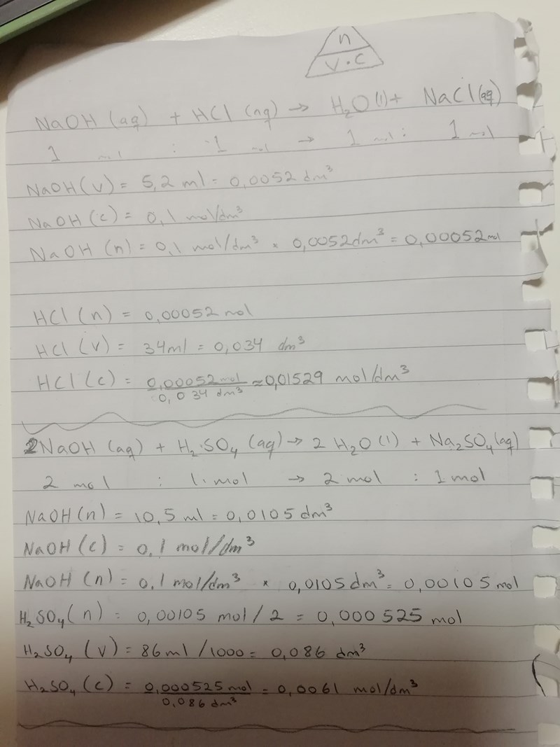 Det skulle ha varit betydligt vettigare att vara ha bestämt koncentrationen av en syra, men ha gjort detta 4 gånger: Först en "slasktitrering" så att man vet ungefär om man skall tillsätta 15 eller 28 ml (exempelvis). Om det var 28 ml, kan man hälla på 25 ml NaOH nästa gång, innan man börjar titrera sakta och droppvis. Den sistnämnda titreringen gör man med tre olika prov av syran, så att man får en hyfsad noggrannhet.